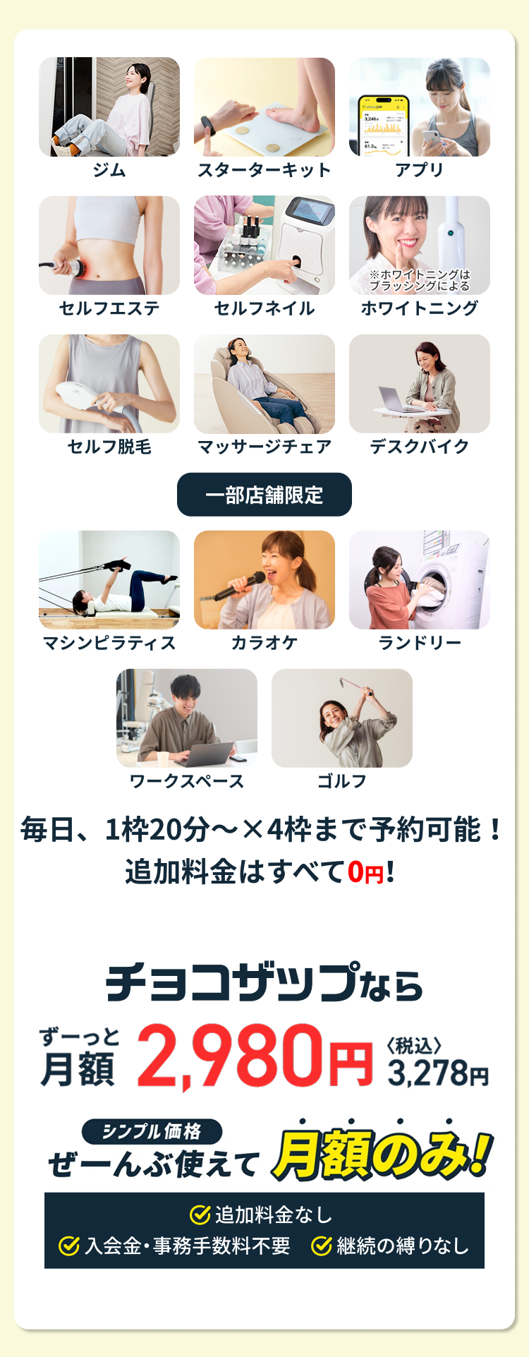 ※サービスおよび関連設備は店舗により異なり、取扱いのない店舗があります。 詳しくはwebサイトの店舗ページでご確認ください。 ※サービスは予告なく変更となる場合がございます。 ※カラオケ・ピラティス・ランドリー・ゴルフ・ワークスペースは一部店舗限定のサービスです。 ※ジム以外をご利用の際はアプリからご予約ください(1枠20分〜)。一度に4枠まで予約できます。