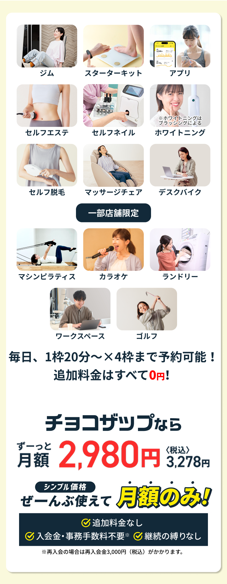 ※お申し込み時「ご利用開始日」を自由に設定いただけます。 ※ジムのご利用にはアプリのダウンロードが必要になります。 ※サービスのご利用には、chocoZAPアプリのインストールが必要です。 動作環境 … iOS14以降 / Android9以降 ※ご契約初月は、初月の日割り料金と翌月1か月分の費用がかかります。