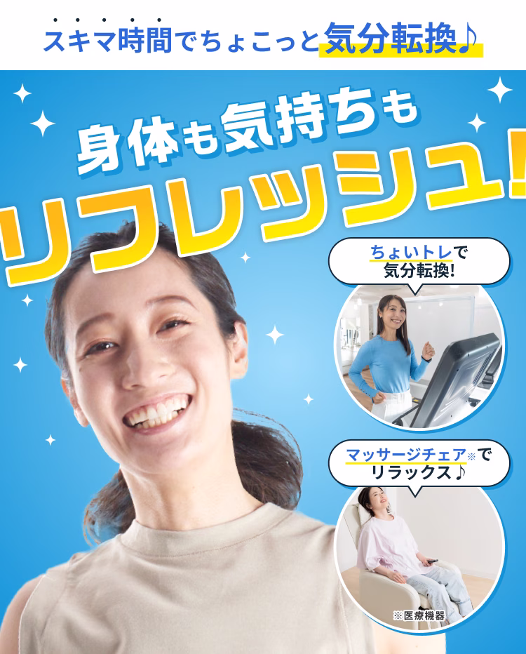 ※サービスおよび関連設備は店舗により異なり、取扱いのない店舗があります。 詳しくはwebサイトの店舗ページでご確認ください。 ※サービスは予告なく変更となる場合がございます。 ※カラオケ・ピラティス・ランドリー・ゴルフ・ワークスペースは一部店舗限定のサービスです ※ジム以外をご利用の際はアプリからご予約ください(1枠20分〜)。一度に4枠まで予約できます。